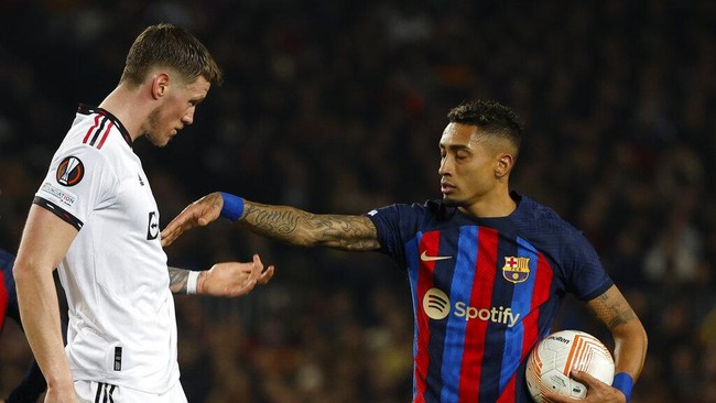 Raphinha jadi starter pada leg pertama Playoff Liga Europa 2022/2023 di Camp Nou, Jumat (17/2/2023) dini hari WIB. Dia jadi salah satu trio penyerang bareng Robert Lewandowski dan Gavi.