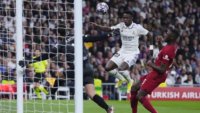 Nyaris! Madrid membuang peluang di depan gawang. Vinicius Junior mendapatkan bola di jarak dekat, meneruskan umpan dari Antonio Ruediger. Sepakannya bisa diblok Alisson Becker.
