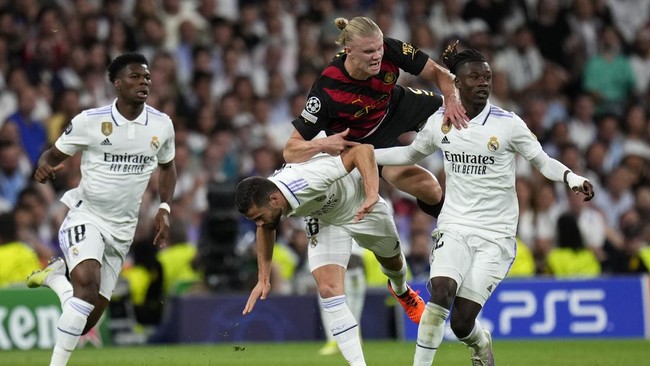 Erling Haaland turun sebagai starter saat Manchester City bertandang ke markas Real Madrid di Santiago Bernabeu, Rabu (10/5/2023) dini hari WIB, dalam laga leg pertama semifinal Liga Champions. Ia bermain penuh namun tak bisa banyak berkutik menghadapi duet bek tengah Madrid, Antonio Ruediger dan David Alaba.