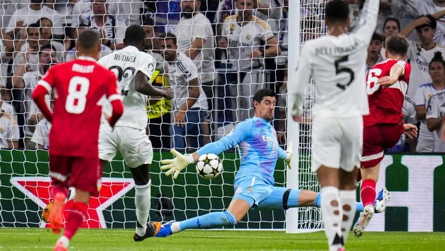 Real Madrid sempat dapat gempuran dari VfB Stuttgart sebelum akhirnya menang. Thibaut Courtois sibuk di bawah mistar gawang untuk menjaga peluang menang Madrid.