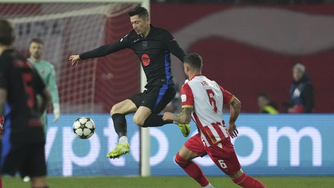 Barcelona sementara unggul 2-1 atas Red Star Belgrade di Rajko Mitic Stadium, Kamis (7/11/2024). Inigo Martinez dan Robert Lewandowski bawa Barca memimpin.