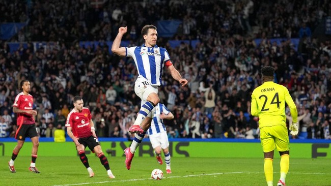 Real Sociedad vs Manchester United berakhir imbang 1-1. Setan Merah unggul dulu lewat Joshua Zirkzee sebelum penalti Mikel Oyarzabal menyamakan kedudukan.