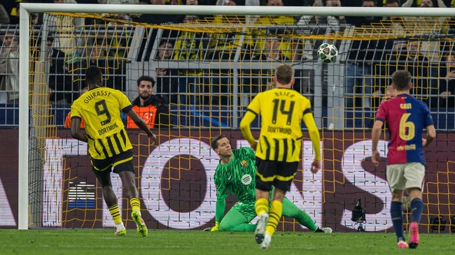Dortmund mendapatkan hadiah penalti di menit ke-11 setelah Pascal Gross dilanggar Wojciech Szczesny. Serhou Guirassy maju sebagai eksekutor dan sukses membawa Dortmund memimpin 1-0.