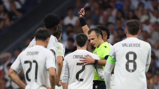 Madrid harus bermain dengan 10 pemain pada menit ke-72. Sebabnya, Dani Carvajal memukul wajah pemain Marseille.