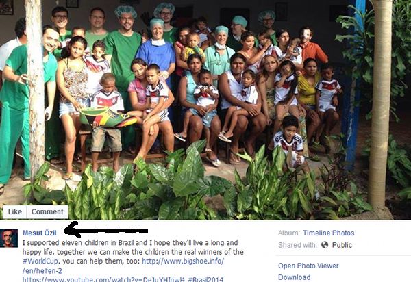 Betapa mulianya seorang Mesut Oezil, yang sebelum Piala Dunia 2014 masih sempat mendanai operasi 11 anak-anak Brasil yang sakit. Terkuak pula bahwa sebelum dan selama Piala Dunia 2014 dimulai, DFB (PSSI-nya Jerman) secara kolektif melakukan aksi-aksi sosial di dekat kamp pelatihan mereka, di Bahia, Brasil. Rombongan Oliver Bierhoff memberi bantuan dana untuk membangun rumah dan beberapa infrastruktur untuk kemajuan masyarakat lokal, termasuk lapangan sepakbola.