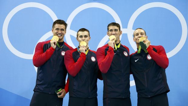 Phelps, yang turun di Olimpiade kelima dalam kariernya, membantu tim AS berjaya meraih emas nomor estafet 4x100m gaya bebas putra dalam lomba Senin (8/8/2016). Tim Prancis meraih medali perak dan Australia mendapat perunggu, seperti dilaporkan Reuters.