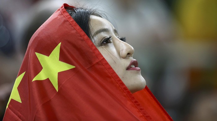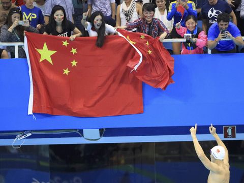 Seperti biasa, sesi itu diakhiri dengan momen dikereknya bendera negara-negara pemenang. Perhatian pun tertuju pada bendera China yang mengapit bendera AS.