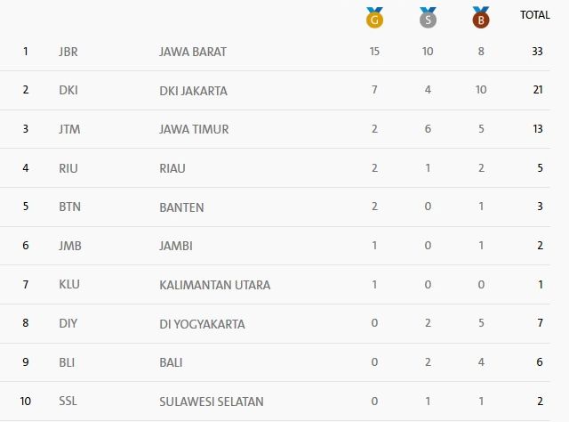 Jabar untuk sementara memuncaki klasemen dengan total 33 medali yang terdiri dari 15 emas, 10 perak, dan 8 perunggu.