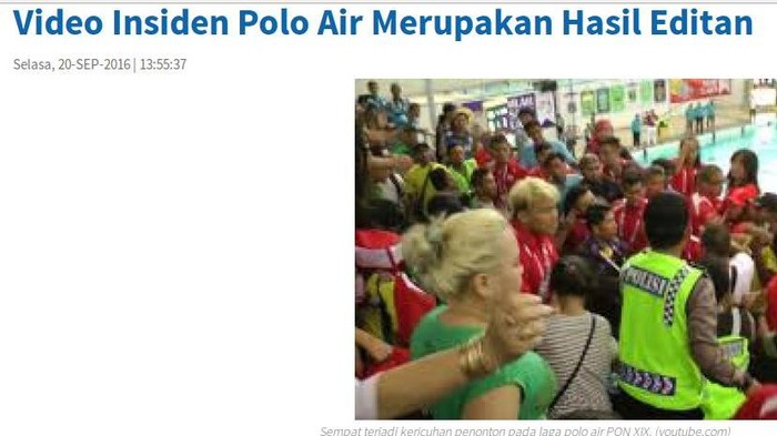 Artikel itu diunggah situs resmi PON pada hari Selasa (20/9/2016), pukul 13.55 WIB. Artikel sepanjang sembilan paragraf itu berjudul: "Video Insiden Polo Air Merupakan Hasil Editan".