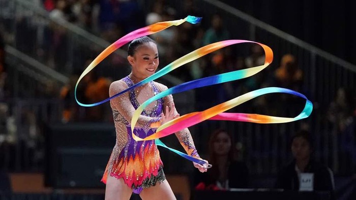 Medali emas yang ke-100 itu diraih oleh pesenam ritmik di nomor pita, Amy Kwan. Dalam perlombaan di MITEC, Senin (28/8/2017), Kwan diganjar skor 15.75 poin.