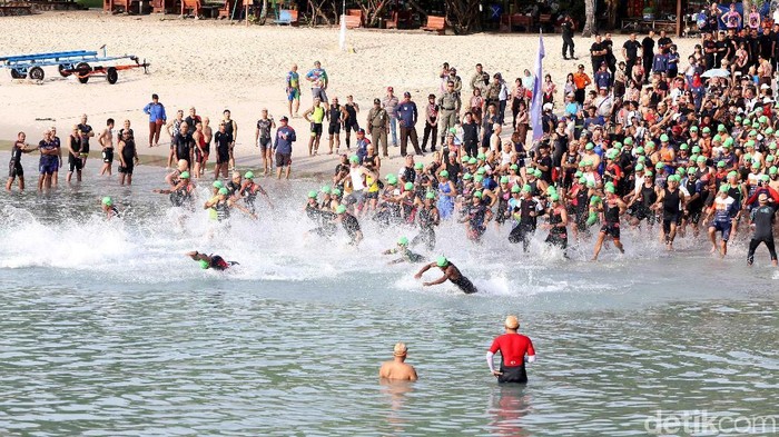 Atlet Triathlon Indonesia, Andi Gumilang, menjadi salah satu partisipan dalam lomba kali ini. Ia terlihat mendapat kalungan medali dari Sekda Babel Yan Megawandi usai melintasi garis finis dalam menjuarai kelas sprint putra.