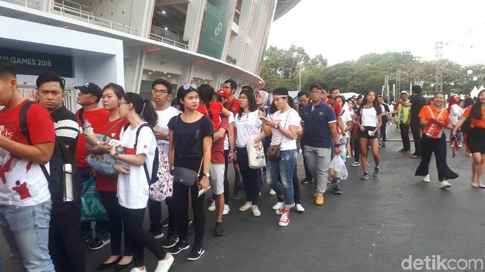 Dari pantauan detikSport, Sabtu (18/8/2018), penonton antre masuk gate sambil mengabadikan setiap elemen-elemen yang disiapkan panitia sampai menuju area gate penonton.