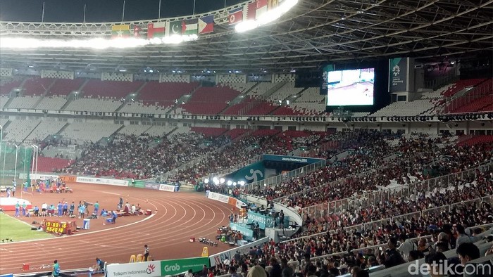 Pemandangan menarik terlihat di tribune penonton SUGBK saat perhelatan cabor atletik Asian Games 2018 yang baru mulai babak kualifikasi sejak Sabtu (25/8/2018). Ribuan suporter memadati tribun dengan menyanyikan yel-yel untuk Indonesia.
