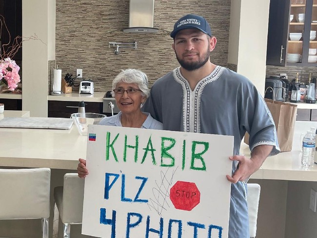 Nenek ini berdiri panas-panasan demi bisa berfoto sama Khabib Nurmagomedov. Presiden UFC, Dana White menghampirinya dan mewujudkannya.