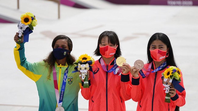 Jepang menambah medali emas lewat cabang skateboard. Atlet berusia 13 tahun, Momiji Nishiya, meraih medali emas di skateboard nomor jalanan dalam pertandingan yang digelar di Ariake Urban Sports Park, Senin (26/7/2021).