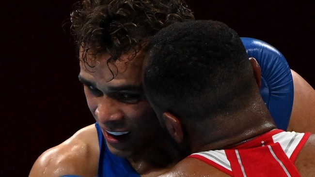 Youness Baalla, asal Maroko, menghadapi lawan asal Selandia Baru, David Nyika, dalam cabang tinju kategori kelas berat putra di Kokugikan Arena, Tokyo, Selasa (27/7/2021). Duel didominasi oleh Nyika.