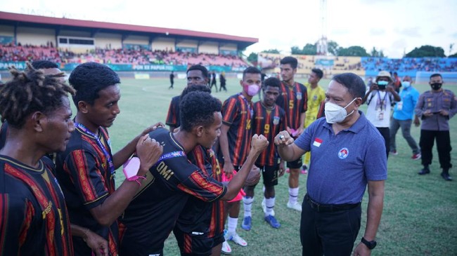 Menteri Pemuda dan Olahraga Republik Indonesia (Menpora RI) Zainudin Amali menonton pertandingan semifinal sepak bola putra PON Papua 2021 antara tuan rumah melawan Kalimantan Timur. Pertandingan tersebut berlangsung di Stadion Mandala, Jayapura.