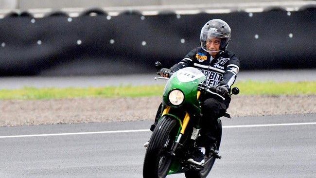 Jokowi mengendarai motor custom dengan warna hijau garapan Katros Garage. Dia mengenakan setelan baju hitam saat start do trek sirkuit Mandalika. Erick Thohir yang mengibarkan bendera start.