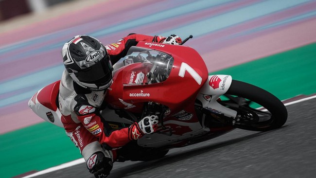 Veda berjuang menghadapi persaingan yang sangat kompetitif di sirkuit Losail, Qatar, Minggu (6/3/2022). Dia bersaing dengan pebalap asal Jepang, Amon Odaki dan Shinya Ezawa.