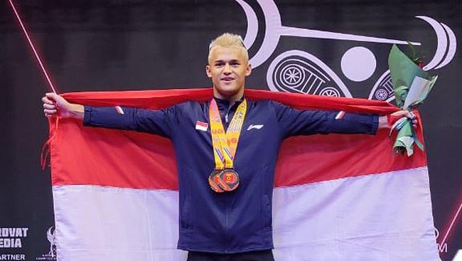 Rinciannya, Rizki Juniansyah dari kelas 73kg junior putra yang meraih tiga emas dan satu pemecahan rekor dunia atas namanya sendiri pada angkatan snatch dari 156kg menjadi 157kg, emas kedua dari angkatan clean and jerk 182kg, dan emas ketiga dari total angkatan yakni seberat 339kg.