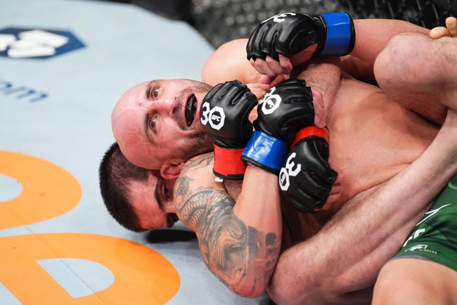 Tangan Islam terlihat sudah dalam posisi mengunci leher Volkanovski dari belakang dengan jurus rear naked choke. Akan tetapi, Volkanovski mampu bertahan dengan baik.