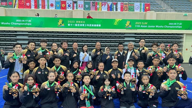6 medali emas, 14 perak (11 Taolu dan 3 Sanda), dan 10 perunggu (6 Taolu dan 4 Sanda) diraih tim Indonesia pada Kejuaraan Asia Wushu Junior XI/2023. Ajang dengan tahuj 11th Asia Junior Wushu Championship 2023 itu berlangsung di Macao, 14-20 Agustus 2023.
