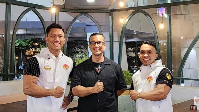 Foto: Ketua PERBAFI Kemalsyah Nasution bersama dua atlet yang akan bertanding di Kejuaraan WFF Asia Pacific 2023 Jepang, yaitu Idris (paling kiri) dan Panji.