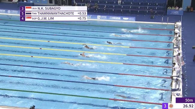 Pada pengembalian menuju 50 meter berikutnya, kecepatan perenang kelahiran 29 September 2003 itu menurun. Alhasil, posisinya pun dibalap oleh perenang Singapura, Glen Jun Wei Lim pada 200 meter berjalan.