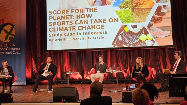 Menteri Pemuda dan Olahraga (Menpora), Dito Ariotedjo, jadi pembicara dalam Kongres Dunia TAFISA 2023 di Dusseldorf, Jerman, Sabtu (4/11/2023). Dalam kesempatan itu, dia bicara mengenai mengatasi perubahan iklim lewat olahraga.