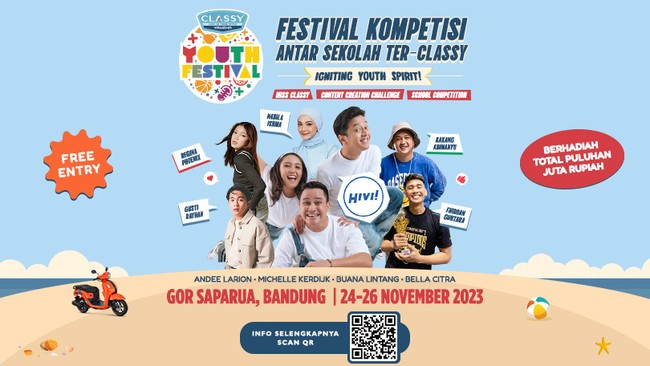 Untuk itu, jangan lewatkan keseruan School Competition Classy Yamaha Youth Festival dan datanglah ke GOR Saparua Bandung untuk mendukung sekolah-sekolah peserta. Informasi lebih lanjut tentang acara, partisipasi Content Creation Challenge, dan vote dukungan Miss Classy, dapat diakses melalui https://www.detik.com/classyyamahayouthfestival.