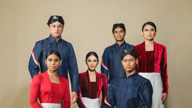 Sementara itu, seragam wanita menampilkan atasan Kebaya Kutubaru dengan warna merah tua yang kaya dan dilengkapi dengan celana olahraga putih. Perpaduan ini menampilkan kesan sporty dan keanggunan yang agung.
