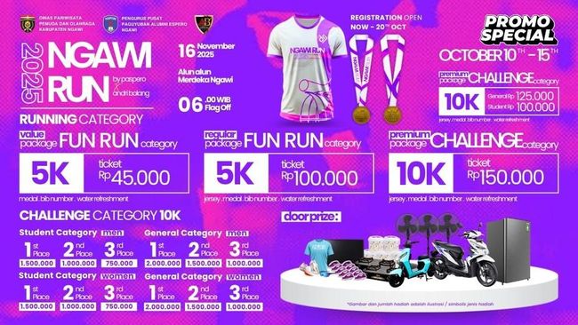 Yang bikin makin menarik, peserta Ngawi Run 2025 juga berkesempatan membawa pulang hadiah total jutaan rupiah serta doorprize spektakuler, mulai dari motor, sepeda listrik, hingga perlengkapan rumah tangga. Jadi, selain berolahraga, kamu juga bisa pulang dengan kejutan besar yang tak terlupakan!